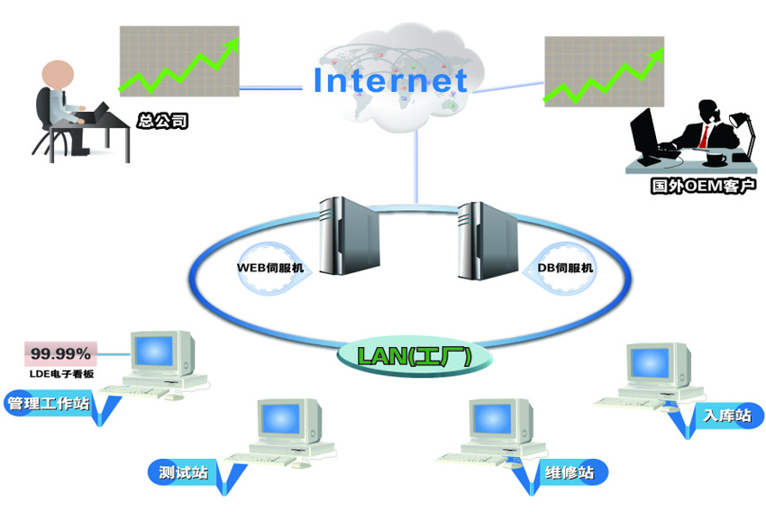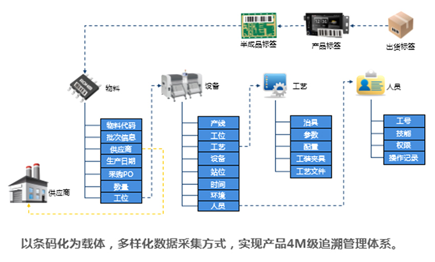 说明:伴随精益生产与数据化工厂的发展,现今多数据企业均已采用了‘生产追溯系统’,并对其进行了扩展,除原有功能外,增加了对供应商与客户的数据化管理,供应商与客户可藉由因特网(InterNet)获取所需要的数据信息。1. 集成条码技术:采用条码/RFID技术,可灵活设置条码标签,支持各种工业级/商业级条码打印机;